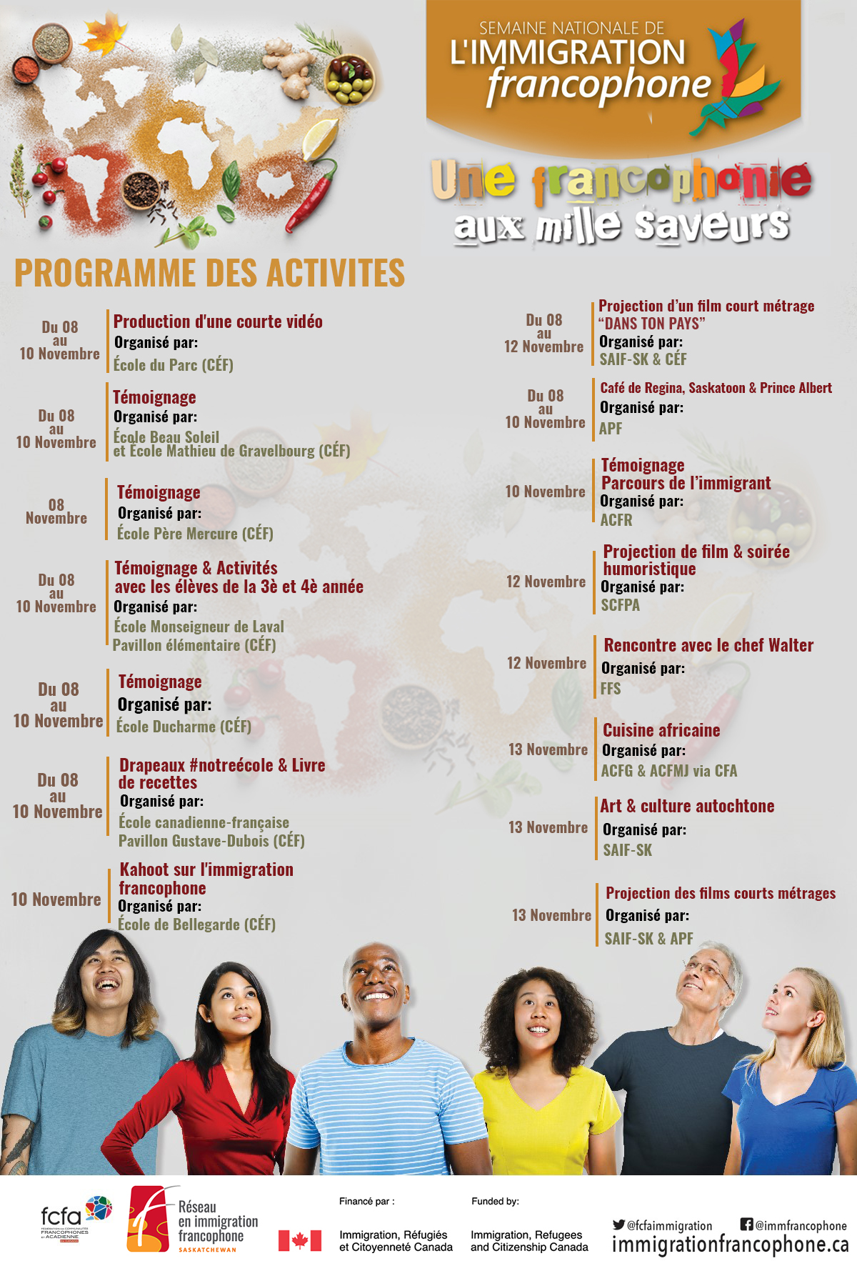 7 novembre 2021 – 7h 0Le Réseau en immigration francophone de la Saskatchewan (RIF-SK) est heureux de dévoiler le programme de la 9ème édition de la Semaine nationale de l’immigration francophone en Saskatchewan.