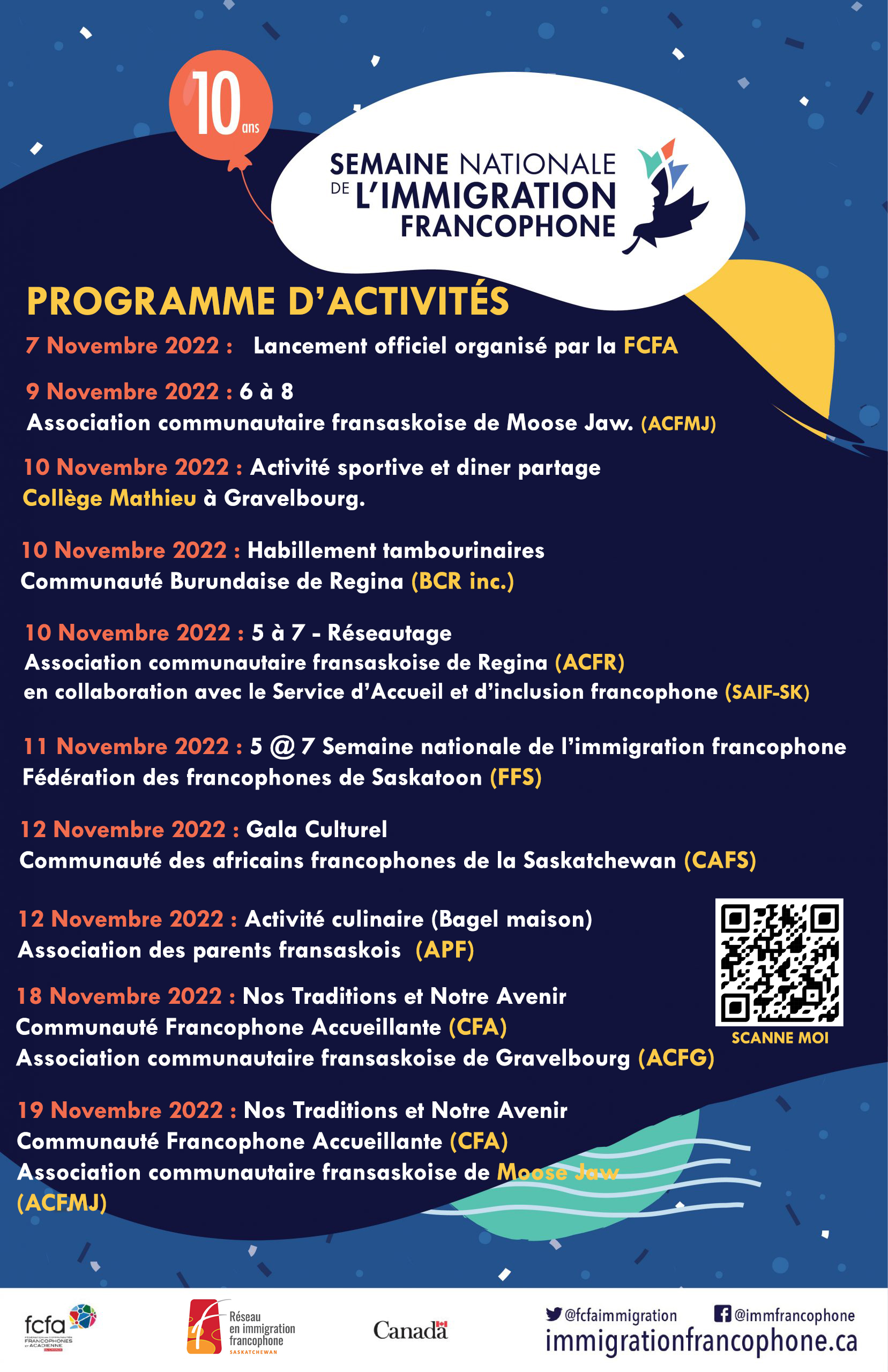 Regina, le 31 octobre 2022 ― Le Réseau en immigration francophone de la Saskatchewan (RIF-SK) est heureux de dévoiler le programme de la 10ème édition de la Semaine nationale de l’immigration francophone, en Saskatchewan.