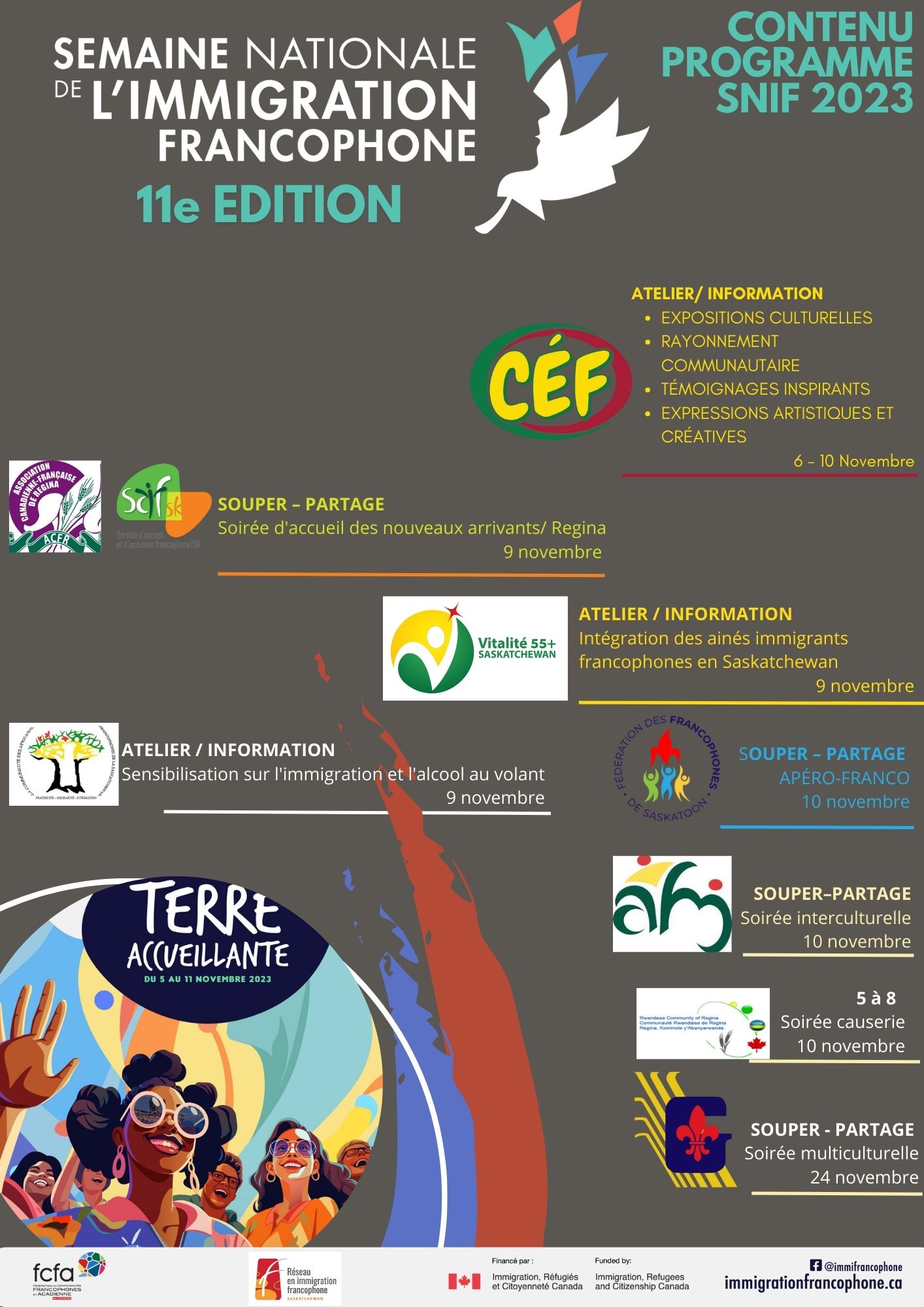 Regina, le 27 octobre 2023 ― Le Réseau en immigration francophone de la Saskatchewan (RIF-SK) est heureux de dévoiler le programme de la 11ème édition de la Semaine nationale de l’immigration francophone, en Saskatchewan.